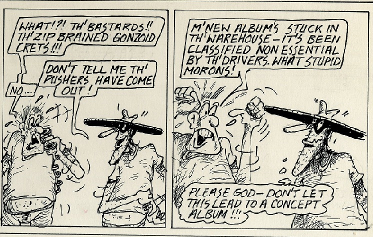 This has to be one of the earliest El Groover strips to appear in the NME. Note the hat and the horse head codpiece all this was at he peak of glam rock when bands were trying to be further and further out. Benyon called this his "anti cartoon strip style" designed to discomfort the viewer. The words were more important then the drawing, in his opinion, and it wasdone as a reaction to the Marvel Comics such as Conan which were truly huge at the time. I seem to remember his favourite was the Silver Surfer.